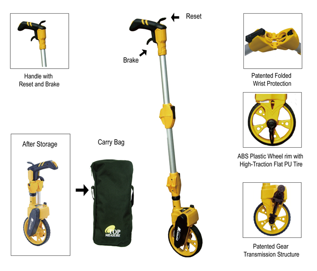 Introducing all new TM06, a 6 inches wheel based tri-folded measuring wheel, which is the newest design of this professional distance measuring market. The new EZ-folding system and the gear transmission system provide excellent fast and easy using experience.